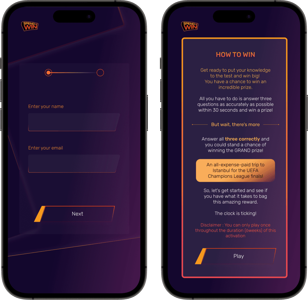 Mastercard Nigeria launched an innovative promotional campaign called Spend N Win to reward its customers and encourage increased engagement. The campaign centered around a fun, interactive online game that could be played at Mastercard booths in 11 malls and supermarkets across Nigeria. The game offered exciting prizes, including an all-expense-paid trip to watch the UEFA Champions League in Istanbul. Our team designed and developed this immersive gaming application to provide a delightful and engaging experience for diverse users, fostering brand loyalty and creating a memorable experience for Mastercard customers.